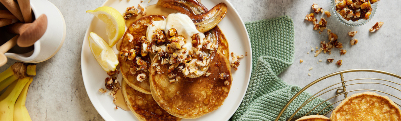 - To serve, divide the pancakes between 4 plates, add a large dollop of yogurt followed by the caramelised bananas on top. Finish off with a sprinkle of the hazelnut praline, a drizzle of maple syrup and lemon wedges on the side.